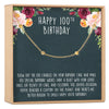100th Birthday Quote: Blow out the 100 candles on your birthday cake and make 100 special birthday wishes. Have a blast with your loved ones, eat plenty of cake, and celebrate this joyous occasion. You've reached a century on this planet, and there's no better reason to smile! Happy 100th birthday!