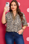 Add a wild twist to your wardrobe with this leopard top. Featuring a color block textured contrast banded detail, this blouse boasts a flattering V-neck, short sleeves, and a pleated back for added dimension. Versatile and stylish, wear it layered over basics or as a standalone statement piece that brings bold personality to any outfit. 100% Viscose