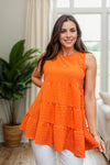 Get ready to embrace the sun in our Sun Kissed tiered top! This orange-colored, sleeveless beauty features a round neck and swiss dot detailing. The tiered ruffle hem adds an extra touch of fun and flair. Perfect for a sunny day out!