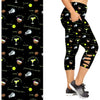 These are for every beach party. It features margaritas, coconuts, lime, salt shaker. Enjoy an island getaway with these festive leggings. They are criss cross capri with large pockets.