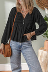 Solid Smocked Split V-Neck Buttoned Blouse